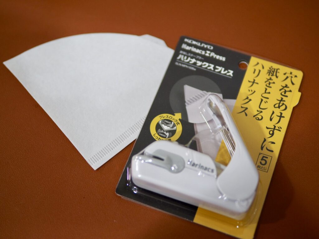 I want to use some other Abaca Plus paper, so I cut a 1~4 cup size filter in half and crimp it with a “KOKUYO needle-less stapler Harinacs” to make a filter for the sharp angle dripper, which I learned from a follower of X. It also can use with a non-woven filter.