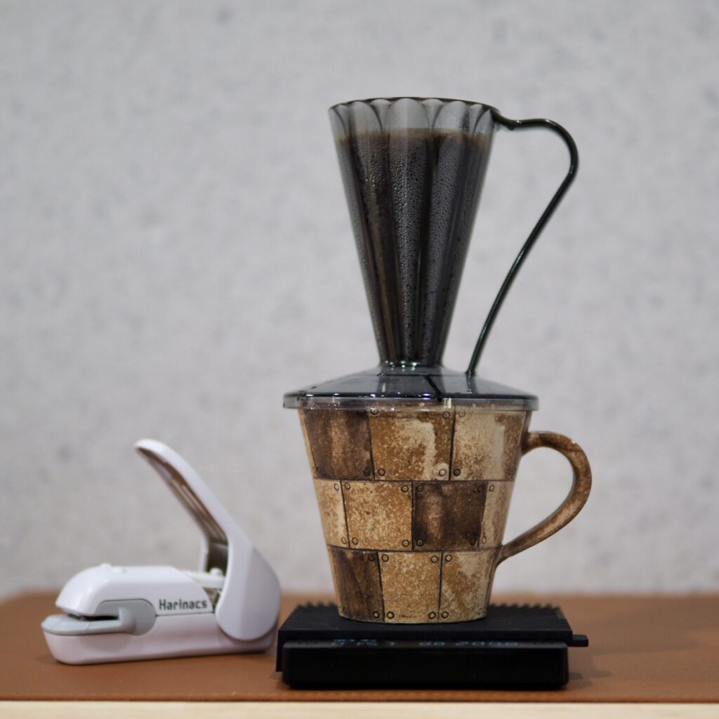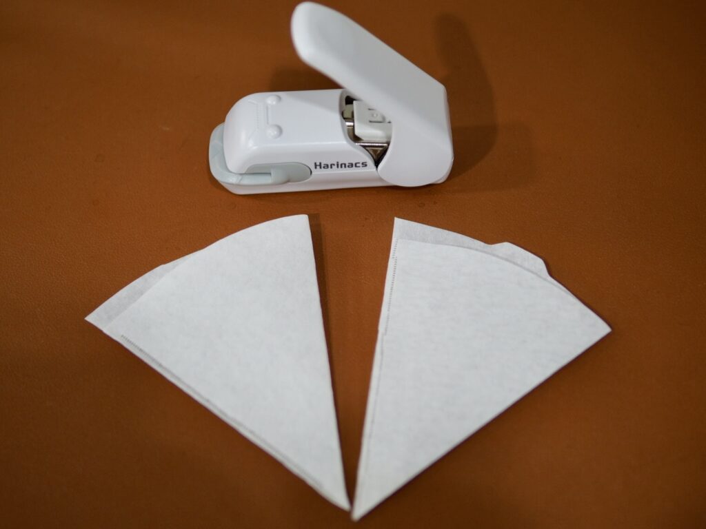 抽出は中心の1点に注げばよく、注ぎ口が細いケトルがやりやすいです。標準のアバカプラスペーパー以外も使いたかったので、Xのフォロワーさんに教えていただいた、1~4杯用サイズのフィルターを半分に切り、「コクヨ 針なしステープラー ハリナックス」で圧着して鋭角ドリッパー用のフィルターを作って使うこともあります。これだと不織布フィルターを使うこともできます。