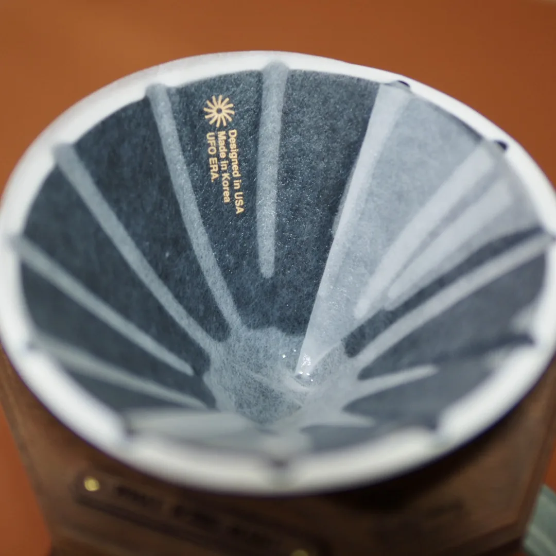 こちらも4月に購入したUFOドリッパー セラミック。80度の角度がついていて、他のドリッパーと比べて全高が低い。そのためお湯を注ぐ高さの余裕があまりなく、ゆっくり注いで、結果撹拌少なめの抽出になることが多いです。ペーパーは専用になる…と思いきや後述に紹介するペーパー(?)が合うのでご参考に。
