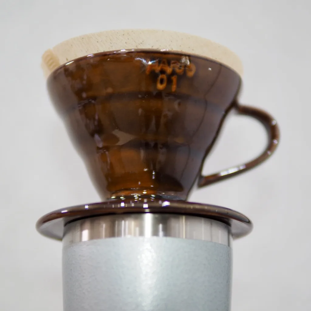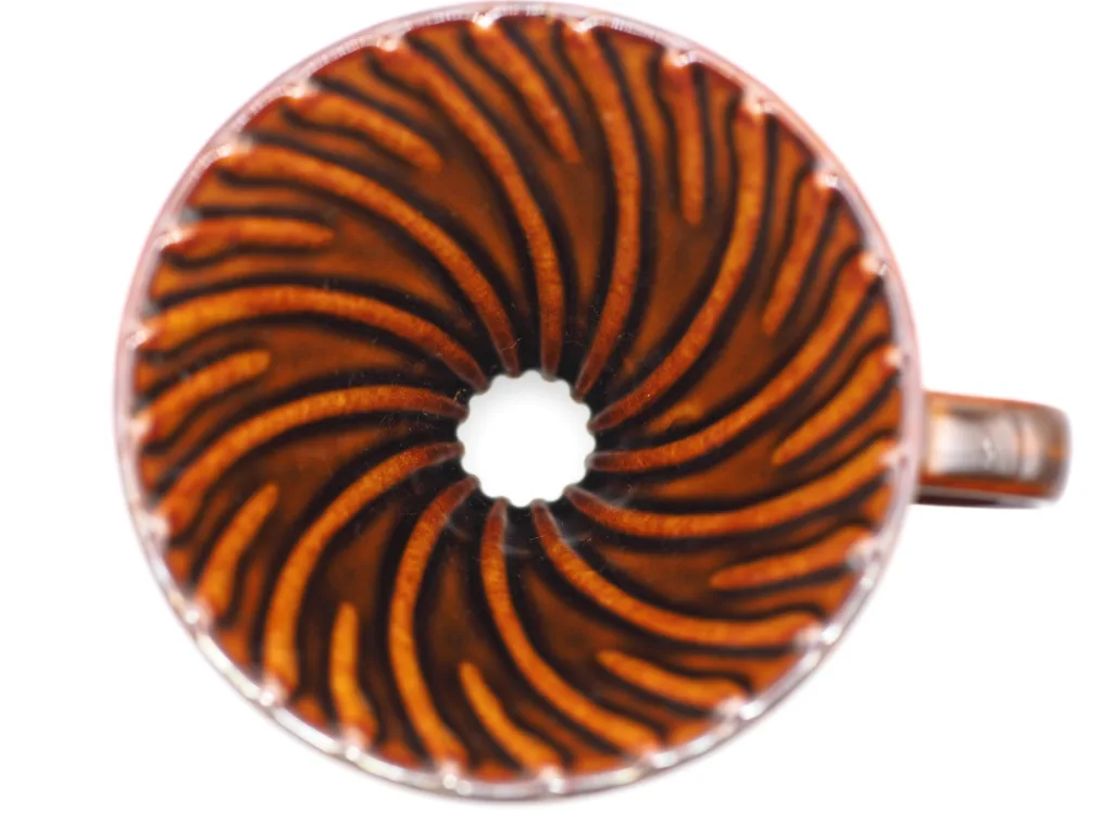 This is the ceramic version of the Hario V60. I bought it around 2014 when I started making coffee. At the time, there were plastic and ceramic versions, and I remember having a hard time deciding between red and brown for the ceramic. The exact color is called Chocolat Brown, and it has a darker shade of color that gives it a more three-dimensional look. There are also subtle differences from the current ceramic model. Perhaps it is due to the manufacturing techniques of the time or the mold used, but I feel the ribs are a bit thicker than the current product.