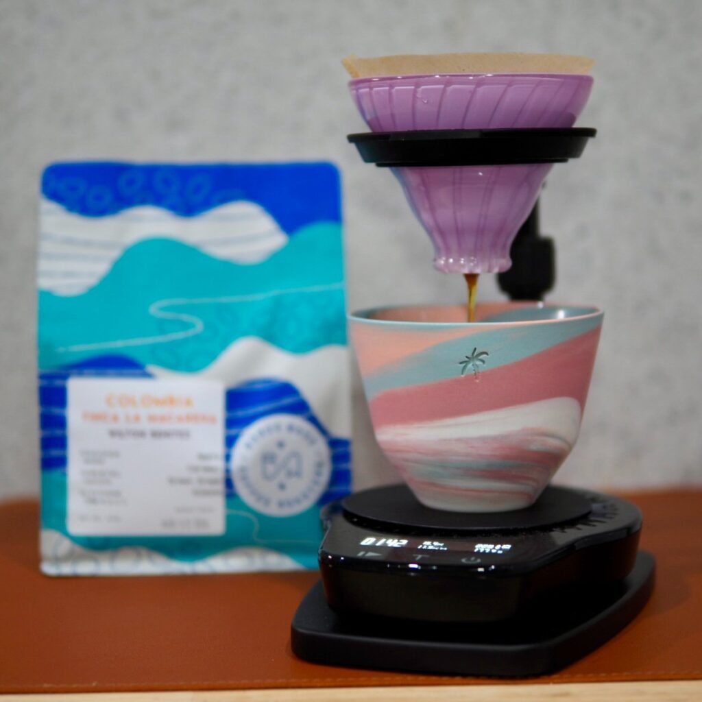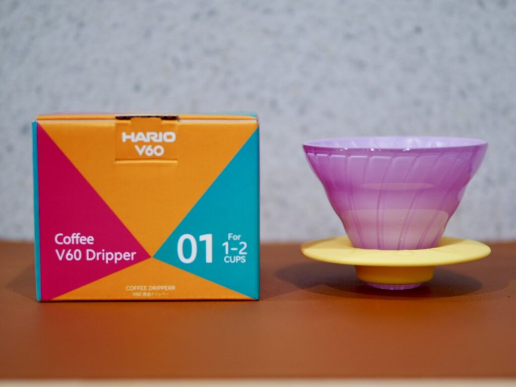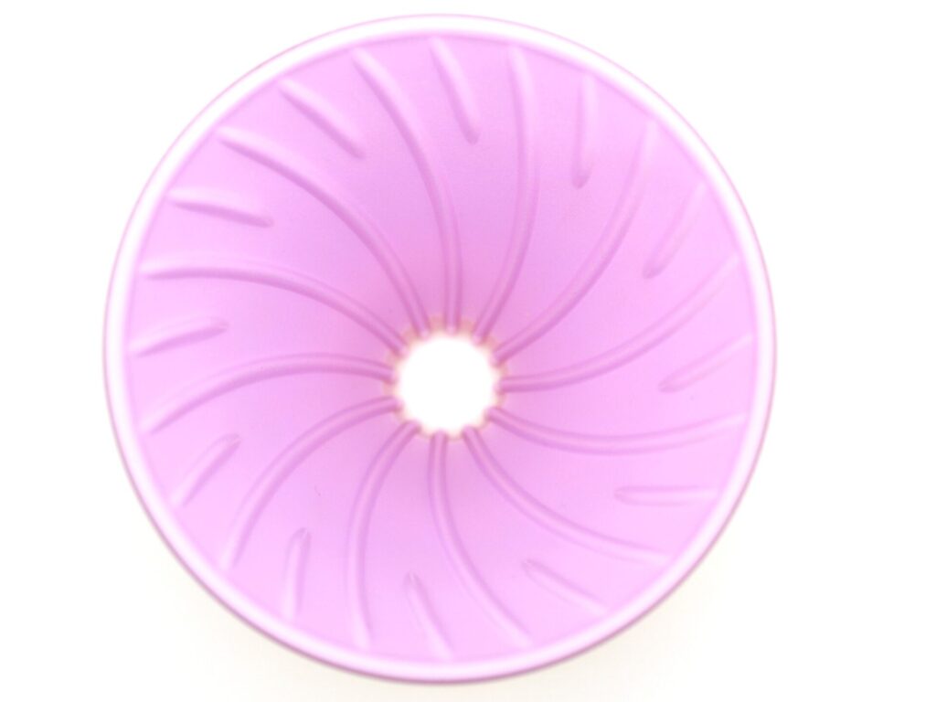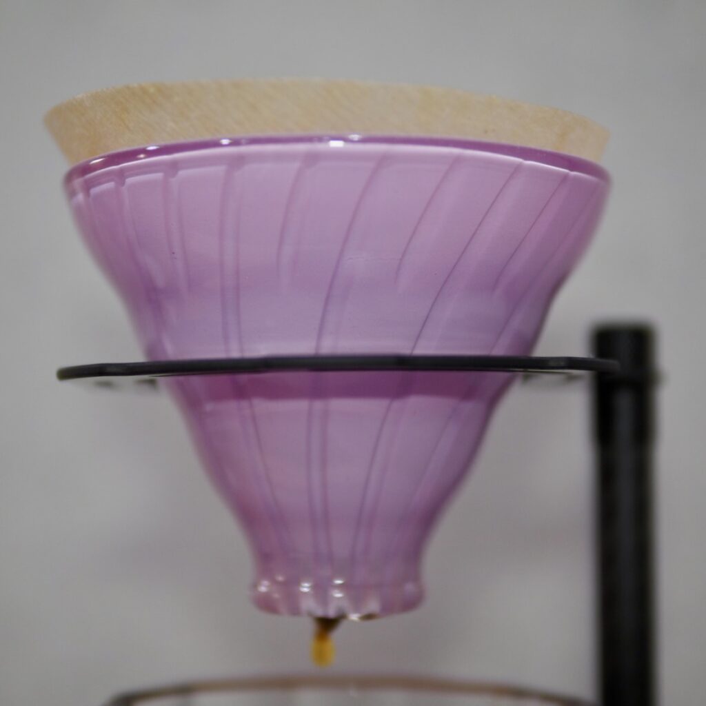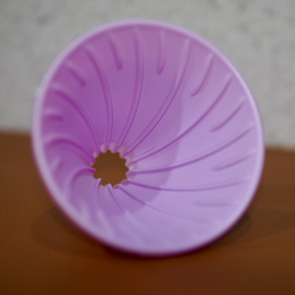 The inside of the Japanese-made V60 glass is sprayed with silicone. The lineup comes in three colors: purple, pink, and yellow, and I like all of them… I’ve seen colored plastic versions of the V60 often, that colored glass V60 was awesome. Only the inside is sprayed with silicone, which is also really nice because it still outside has the texture of glass.
