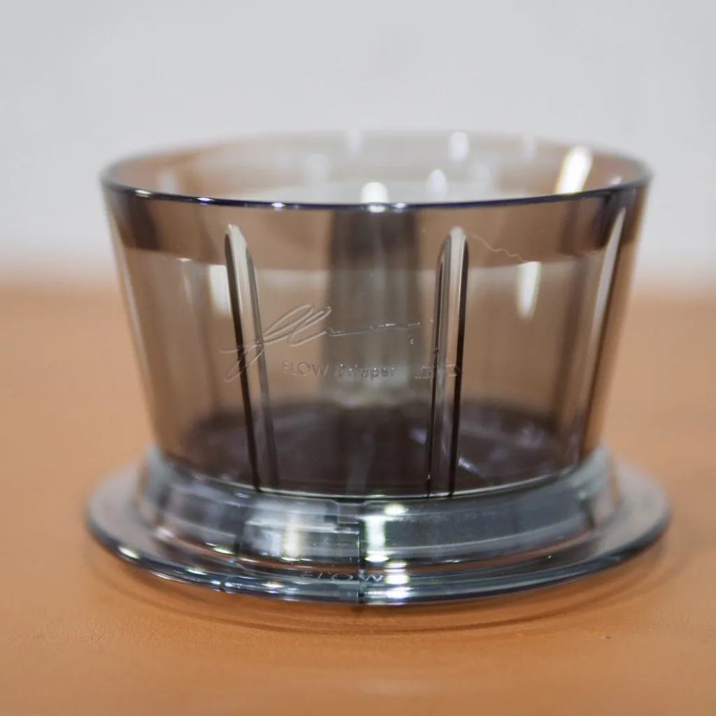 ハリオ台湾がTri-up Coffeeと作ったドリッパー、FLOW DRIPPER。第1弾では陶器製でしたが、第2弾のこちらは素材がトライタンになり、価格が安くなり、サイズも少し大きくなり本体が分割できて洗いやすくなりました。サイズアップを除き、基本的には第1弾の01と同様に、中央の柱がユニークで抜けが早く、後半も詰まらないのが特徴です。焙煎度や挽き目が変わっても抽出が安定するオールラウンダーです。最近ではフラットペーパーのフィルター(油こし紙)をネゴシエーターを使ってぴったり貼り付けての抽出が好みです。より抜ける速度が上がり、抽出が1分半以内で終わるくらい。フラットペーパーを使ってから、このドリッパーがもう1段階楽しくなりました。