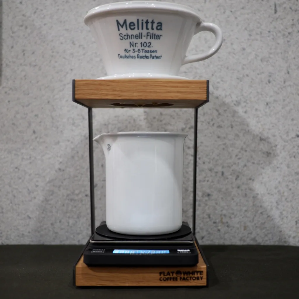 メリタが製造したドリッパー(メリタ的にはフィルターと呼ぶ)の中でも最古参のモデルがこの8つ穴で、製造されたのは1930年代。当時はアルミ製のフィルターと組み合わせたり、円状のペーパーを追って使っていたそう。この頃のモデルは、現行のメリタ製品のような台形方ではなく、底が平らな今で言うフラットボトムの形状をしています。これが不思議なことに、現代のウェーブフィルターと組み合わせて使うことが可能です。さらには最近のアイディアであるブースター(44mmのプレート)も使うことができます。この絶妙なサイズ感は、現代でも通じますね。写真のモデルはメリタのロゴが筆記体ではなくゴシック体です、これについては詳細がわかっていませんが、筆記体でないメリタのロゴは新鮮に映ります。