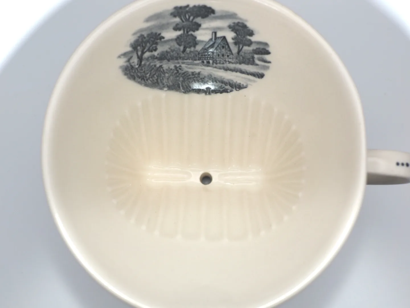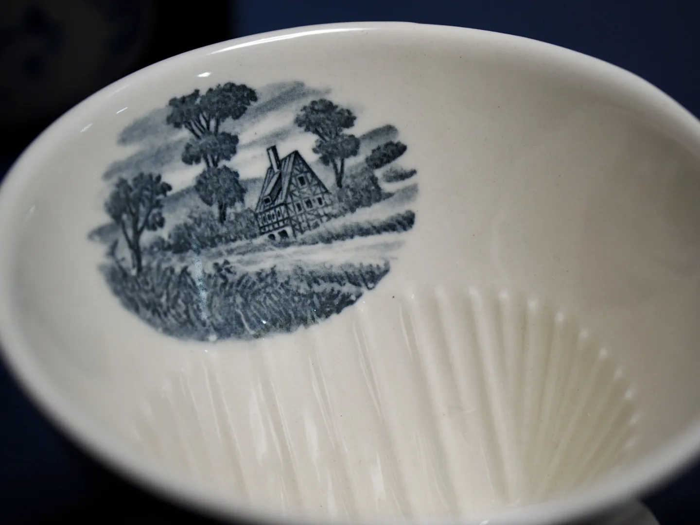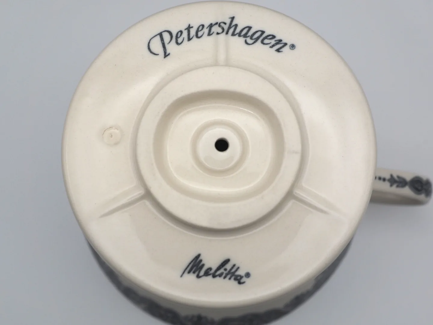 絵付けが美しいメリタのヴィンテージドリッパーです。「ピータースハーゲンはメリタの故郷 北ドイツの風景を焼きつけた美しい高級フィルターです」と箱に買いてあります。年代は1970年代以後、というところですね。おそらくですがドイツ製です、ただネット検索だとほぼ日本語の情報なので明確ではないかもですね。ブルーブラックでの絵付けがとても美しく、ドリッパー外側・内側から持ち手に至るまで、丁寧に描かれています。これはもう工芸品だ、って思って使っていません。飾っているだけで美しい、そんなドリッパーのひとつ。
