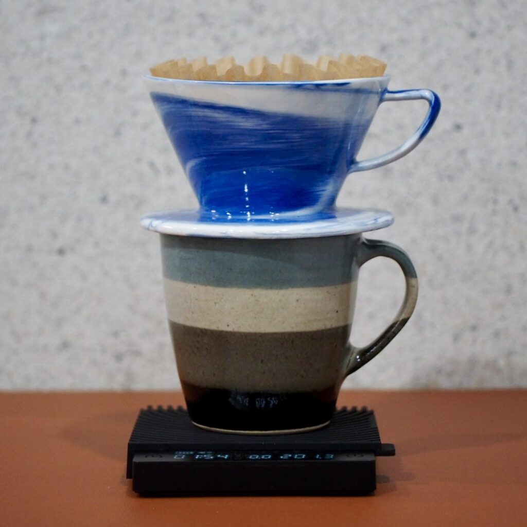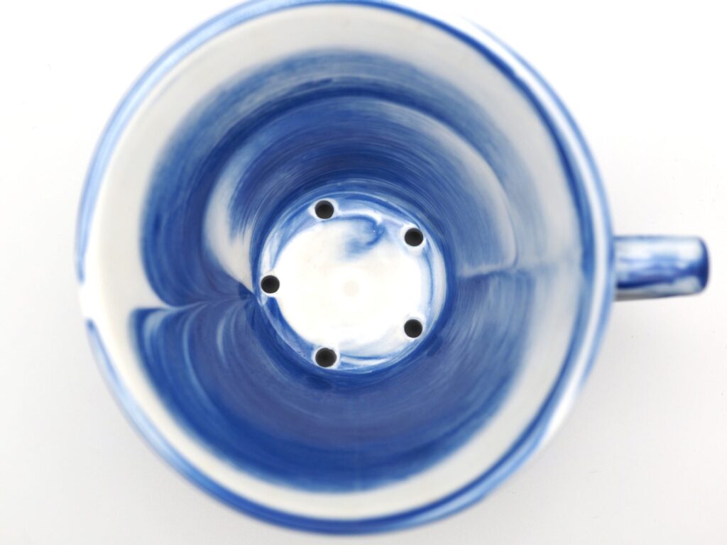 MK STUDIOはデンマークの陶器メーカーです。特にポップでユニークなカラーリングの小ぶりのカップは、いちど見ると欲しくなってしまうプロダクトですね。そんなブランドから発売されているMKドリッパーも、さまざまなカラーや吹きつけなどで作られていて、カップと同様にポップなカラーリングのドリッパーです。ドリッパーの形はスタンダードな印象ですが、外側・内側に丁寧に吹きつけられた模様がオンリーワン感を出していて、所有欲を満たしてくれます。抽出面では底の外側に配置された5つの抽出穴で、少し早めで安定感があります。注いでは落とし切り、また注いでは落とし切り、のような抽出が得意かな、と思いますね。