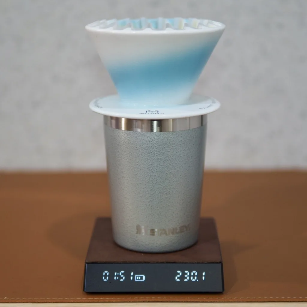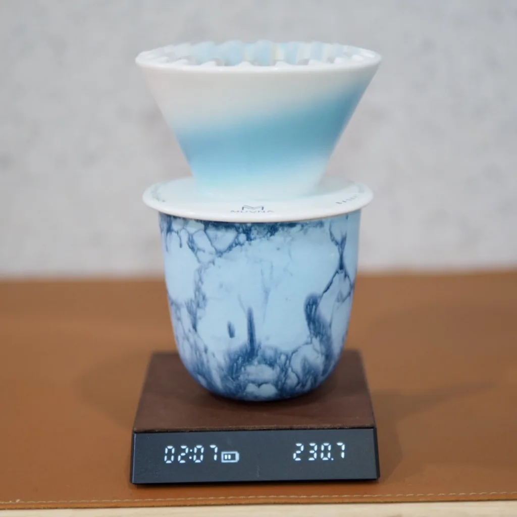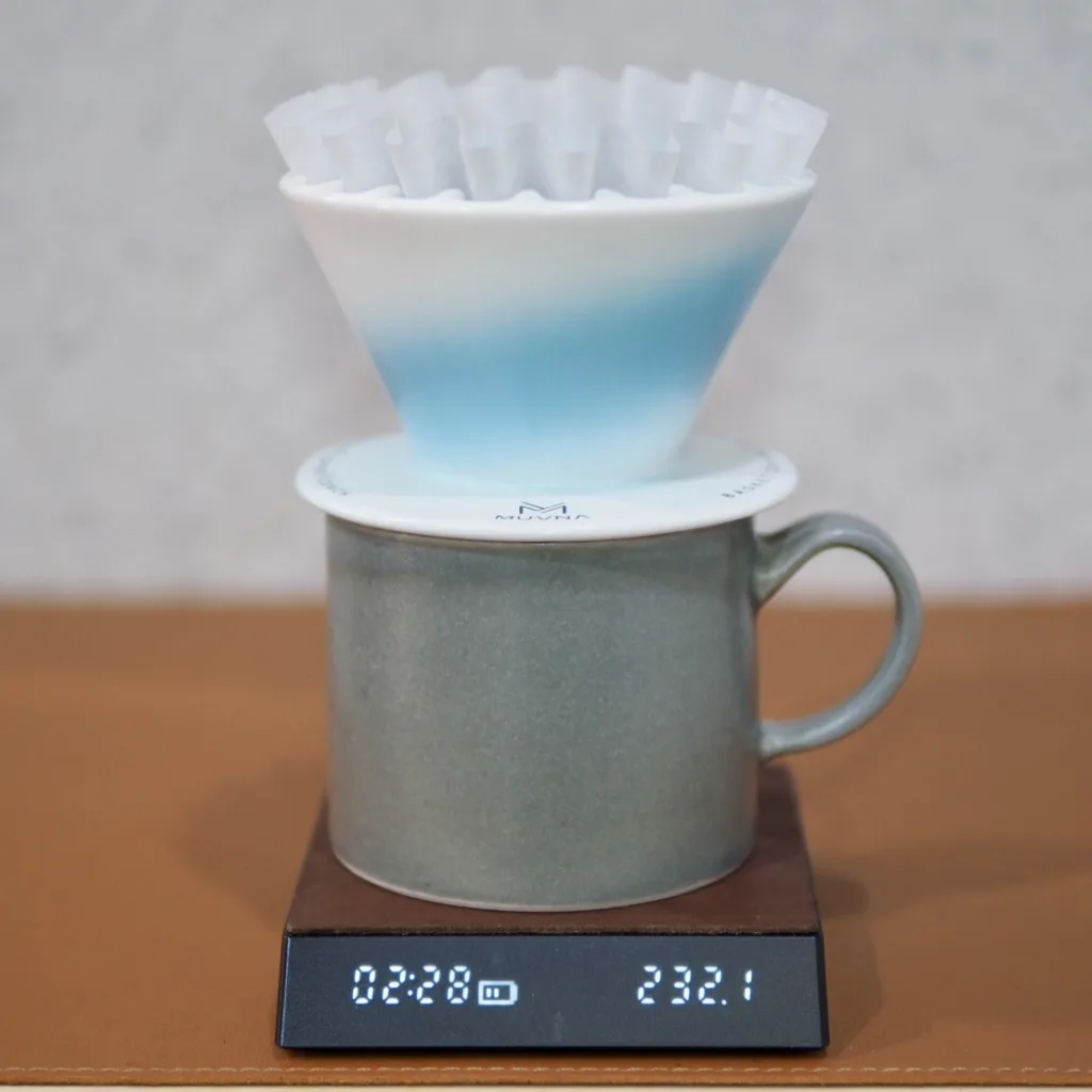 What makes the dripper unique is its shape. As you can see, it is shaped like the wave of a wave filter; a 155-size wave filter fits perfectly and the dripper and paper become one. It has a single extraction hole, which is similar to the April Brewer in shape. Regarding extraction, the flow rate is fast. I often use it with a fine grind and normal flow rate (about 2 minutes total including steaming). I find that it is easy to stick the wave filter on snugly, so the variables (blurring) caused by the paper are quite small. It is much easier to apply the paper without using the rinse assist tool. I also quite like the coloring, which looks like it was sprayed on with an airbrush.