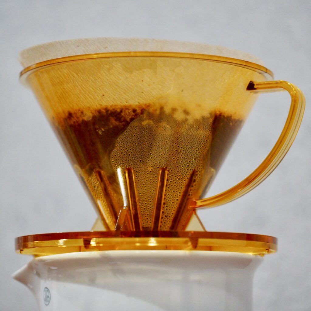 インドネシアのコーヒー器具メーカーSUJI Premium Handcraftedから発売されている円錐型のドリッパーです。この見た目からイメージするのは、そう、コーノ名門フィルターですね。意匠登録などから数十年経っているので問題ないとは思いますが、リブの数や長さ、外観はほぼ同じです。異なるのは素材、上部やホルダー部などの細かな違い、そして重さです(SUJIの方が10gほど軽い)。けっこう使ってますが、ヒビは入ってません。