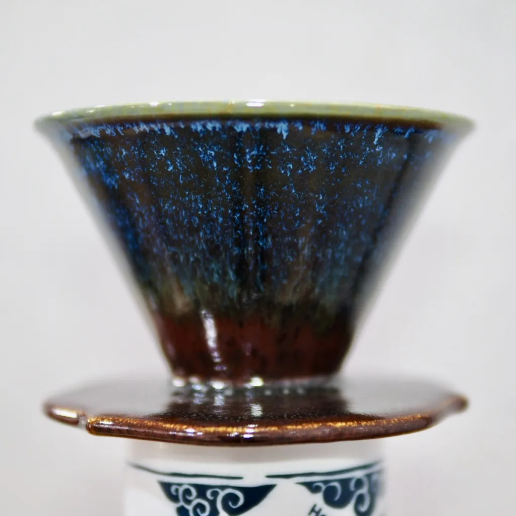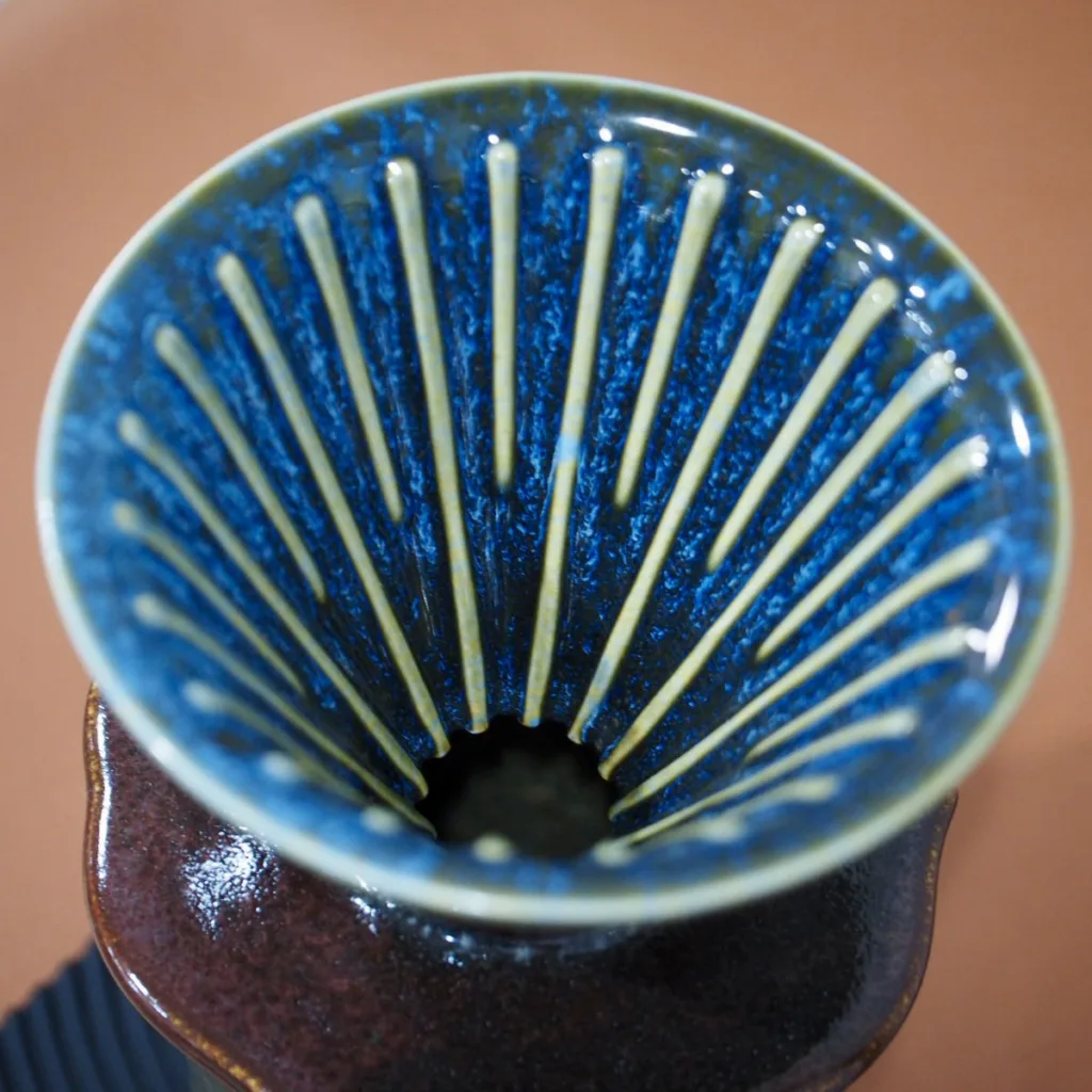 台湾の北部の陶器の街、鶯歌で作られたドリッパーです。特筆すべきは天目と称されるユニークなカラー、日本だと「天目茶碗」で有名な模様です。宇宙のようで引き込まれそうな印象があって、見ていても楽しいです。カラー以外ではドリッパーの角度が50度なことが特徴ですが、60度用のフィルター(1~2杯用)が問題なく使えるのも良い点。リブがけっこう立ってるのもあって使えるのかな、とも思いました。抽出は少し貯まりやすいですが、抽出穴が大きいので詰まることはほとんどありません。独特な魅力のあるドリッパーです。